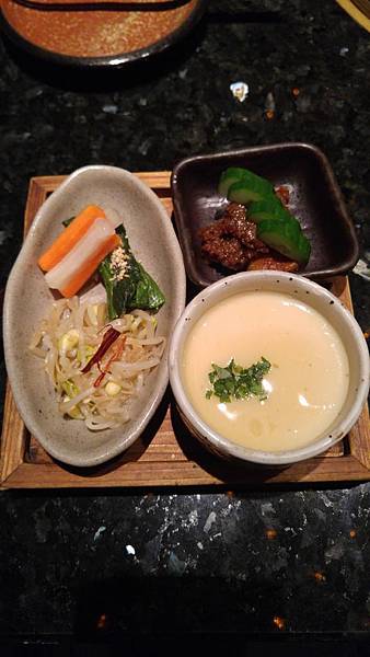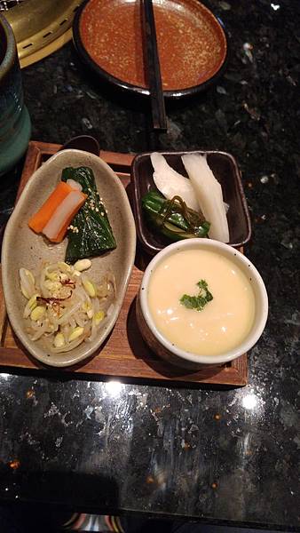 套餐附的茶碗蒸和漬物,右上角那小盤是牛肉,非常鹹!
