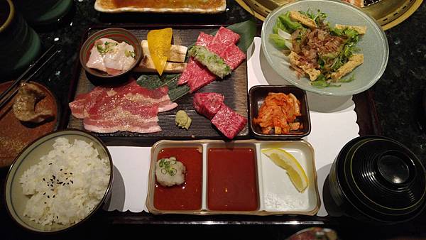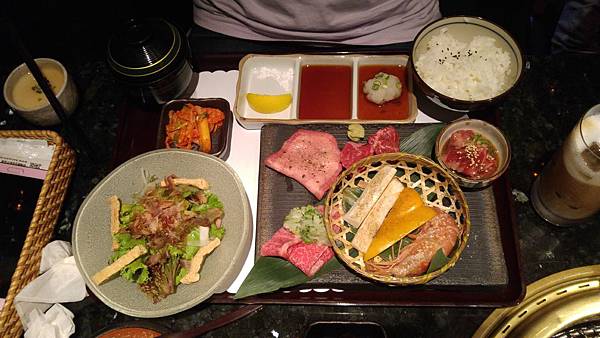 包含越光米、和牛烤肉醬部位、蝦子和野菜、和牛姿切部位、熟成冷藏牛舌、和牛薄切部位