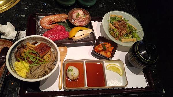 包含星鰻鰻魚丼、和牛牛五花、蝦子和野菜、雞胸肉