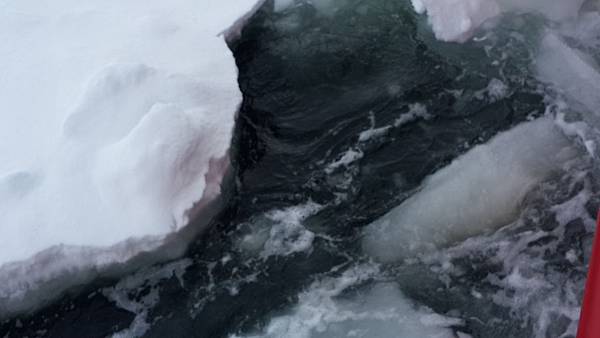 船尾可以看到船經過的痕跡,把流冰都破開了