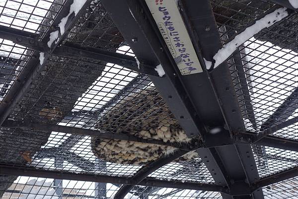 一坨毛毛的是雪豹! 在頭頂上,毛穿過籠子了! 好可愛~~~