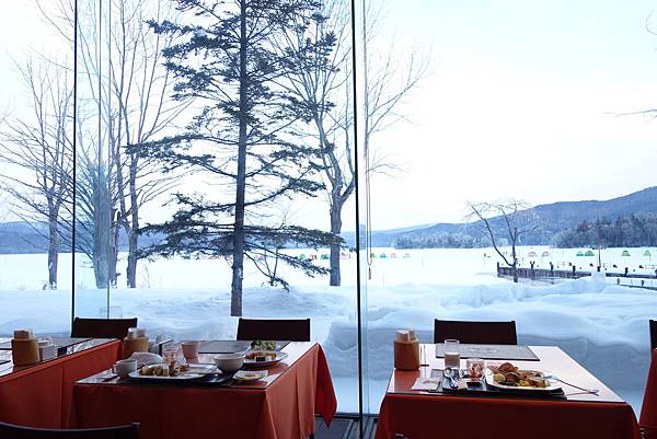 泡完溫泉,全身舒暢,搭配雪景吃早餐~