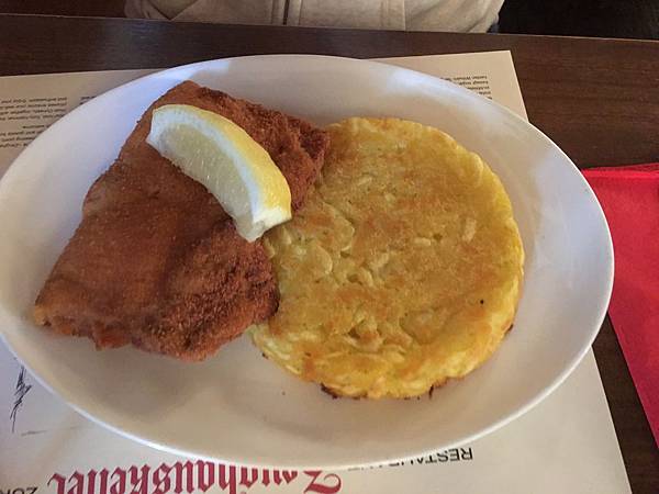 起司豬排、馬鈴薯餅、香腸。分量很多,口味還可以,馬鈴薯餅比較油膩