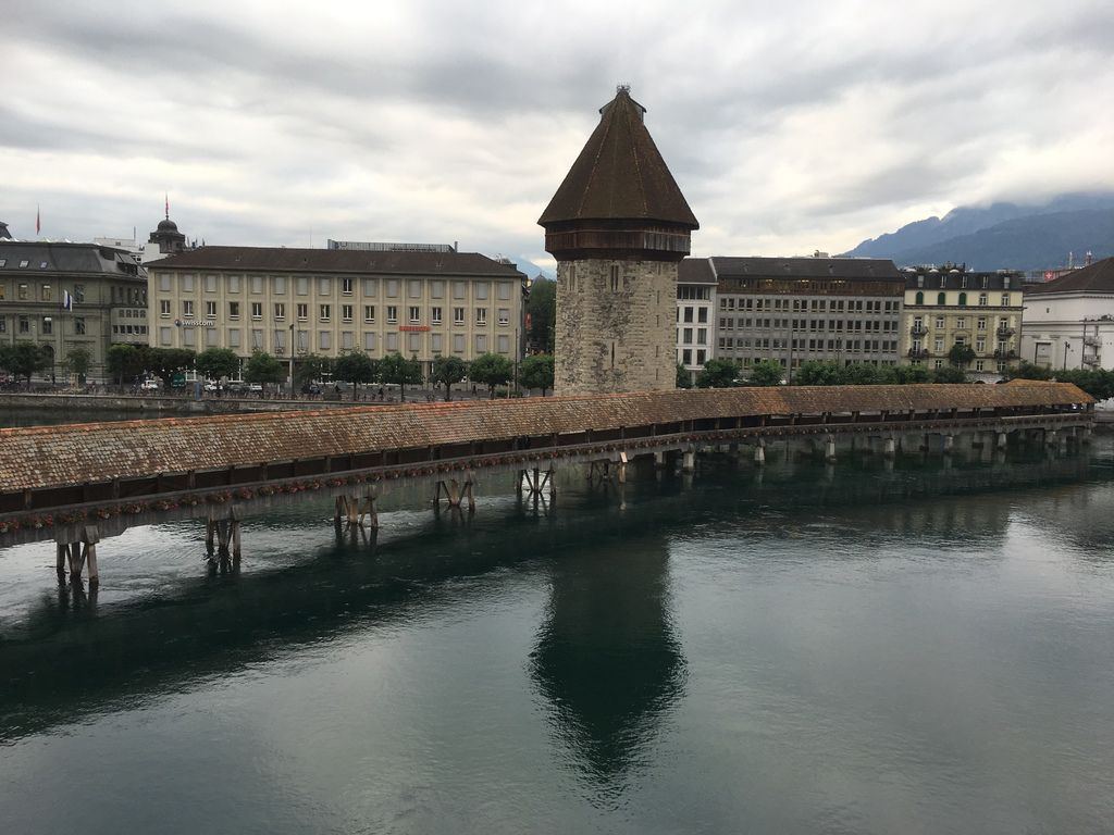 晚上入住琉森Luzern,旅館就在卡貝爾橋旁,很讚!