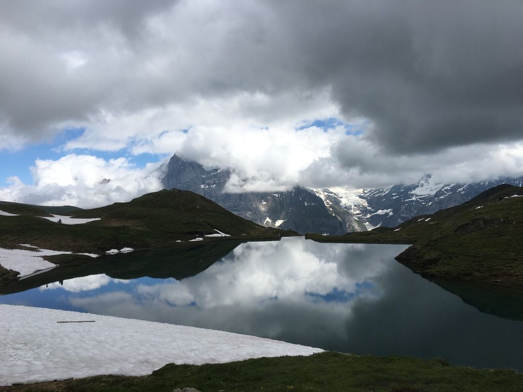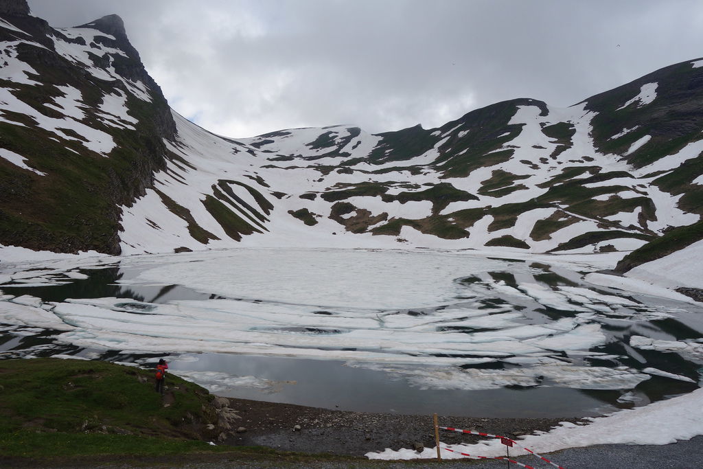 但下午雲層變厚,健行到Bachalpsee湖,山都被雲擋住了,湖面也沒全融,蠻冷的,可能要7月來才能看到融冰的湖吧