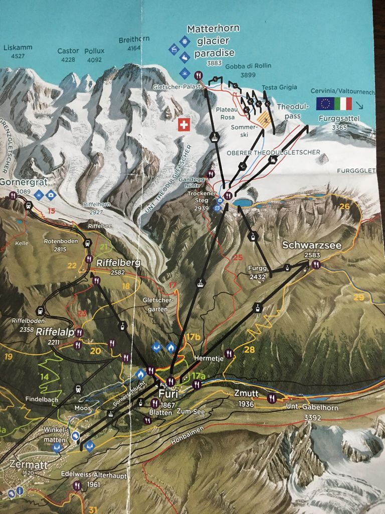 這條纜車路線從Zermatt(1620m) - Furi(1867m) -Trockener Steg(2939m) - Matterhorn glacier paradise(3883m)